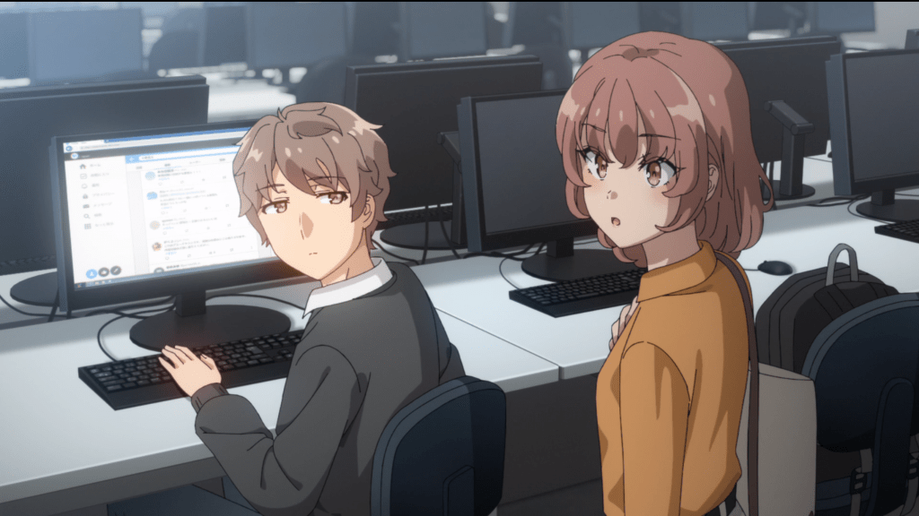 Yokohama City University, computer lab. Sakuta is talking to the guy who invited him to the matchmaking party last night, Fukuyama, and Fukuyama wants to know why Sakuta doesn’t get along with Kamisato. Saki Kamisato is the girl who showed up late for the party, and the reason Sakuta had a bone to pick with Kunimi last episode. I totally forgot that Kunimi had a girlfriend, shame on me. Fukuyama jets off only to leave Sakuta with Saki herself; this is going to be awkward. Saki said she was invited just to balance out the numbers on the girls’ side, and I reiterate my complaint from last week: why invite people who are already dating to a matchmaking party? The fact that they had two committed people there just to “even the numbers” shows the numbers didn’t need to be even in the first place.