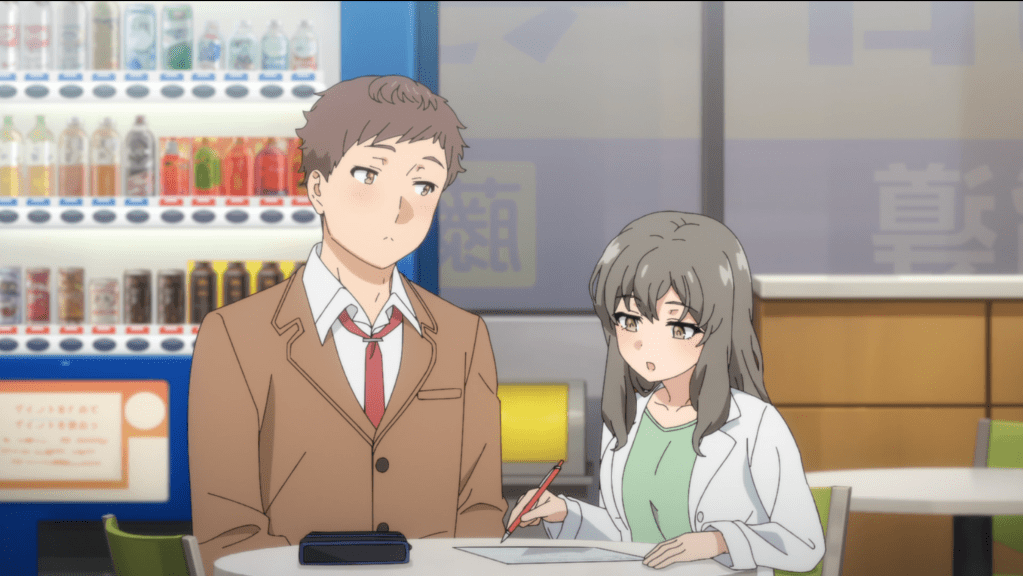 Cram school: Sakuta walks in to see Futaba tutoring the tall basketball player that Kunimi mentioned last episode. I can’t tell if he has a crush on Futaba or if he just can’t focus on the material. *watches again* yeah it’s a crush.