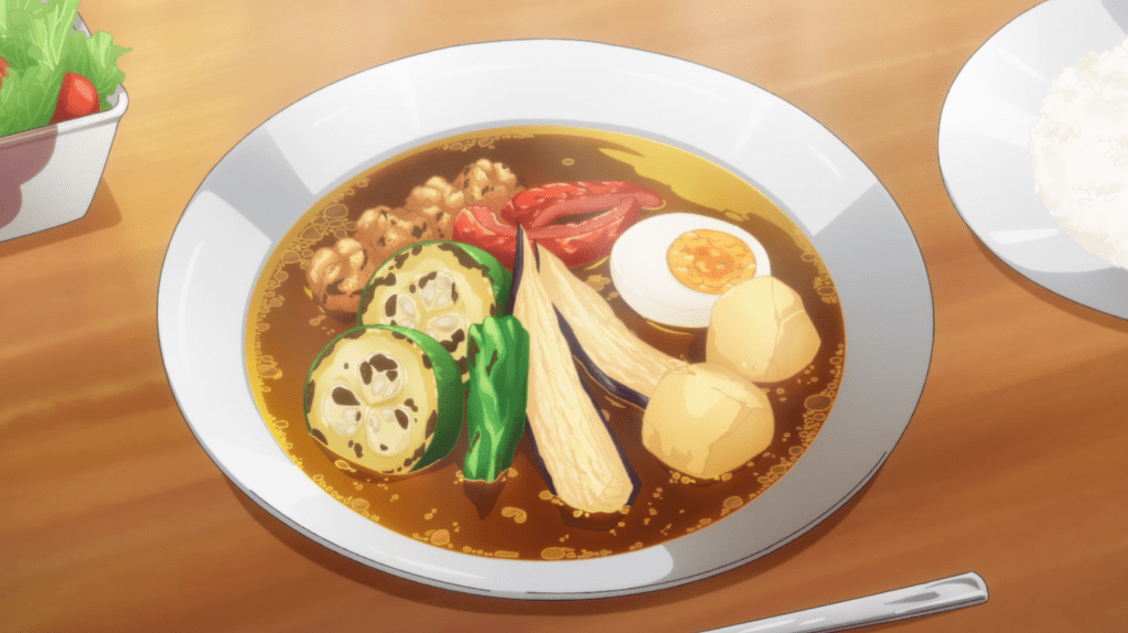 Above the cake shop, Rintarou and his mom sit down to dinner. As with most anime food, dinner looks amazing: