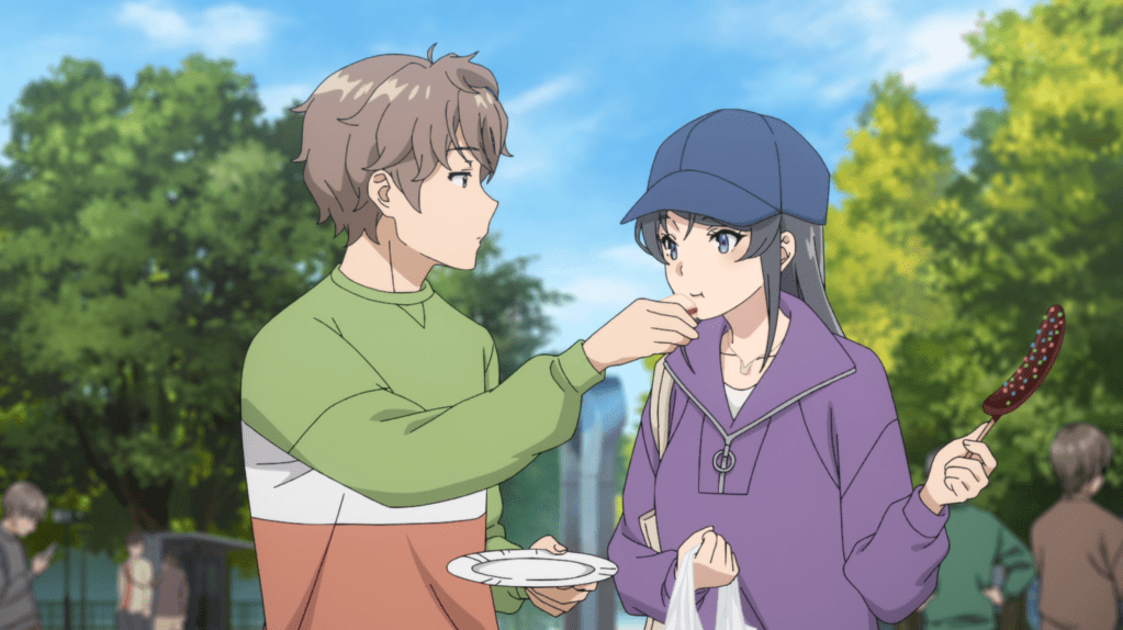 November 6th. It’s the Sweet Bullet concert at the college festival. Sakuta, Mai and Kaede are all in attendance. The host asks for the girls to do an encore and they looked shocked, like they had never considered that this might be a possibility before. After the show, Mai and Sakuta go backstage and the Sweet Bullet girls give them a list of treats they want the couple to pick up from the festival. I like that Mai is down-to-earth enough that she’ll play fetch for other people. Of course, they get a few treats for themselves, including a taco, and I’m wondering if this is the first time I’ve seen a taco in anime. You expect to see takoyaki and chocolate bananas at a festival, but a taco? Interesting.