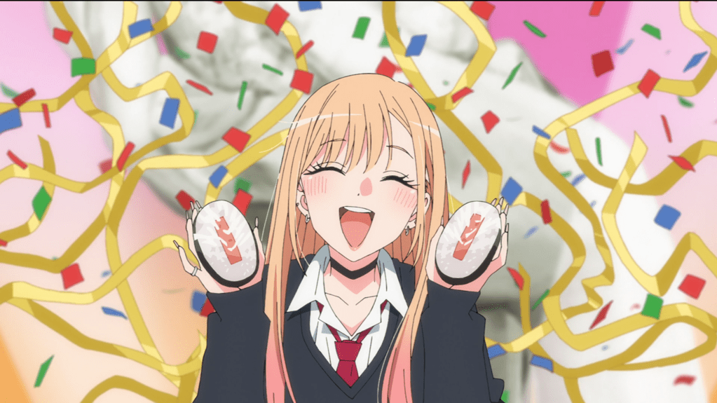 Marin is eating dinner over at Gojo’s house, and we learn that the business produces 200-300 hina dolls per day. Marin thought it was more like ten, and to be honest, that’s what I thought too. It seems like it’s too painstaking an art to be done in bulk like that, but I guess skilled craftsmen working in teams can handle it. I would be really interested in seeing more of Gojo’s family’s traditional doll business, but I think we saw all that we’re going to see of that in the first season. To explain hina doll production, the show briefly turns into a puppet show, harkening back to the NHK network’s long history of the art form. It’s amazingly detailed– even Puppet Marin has two-tone blonde and pink hair.