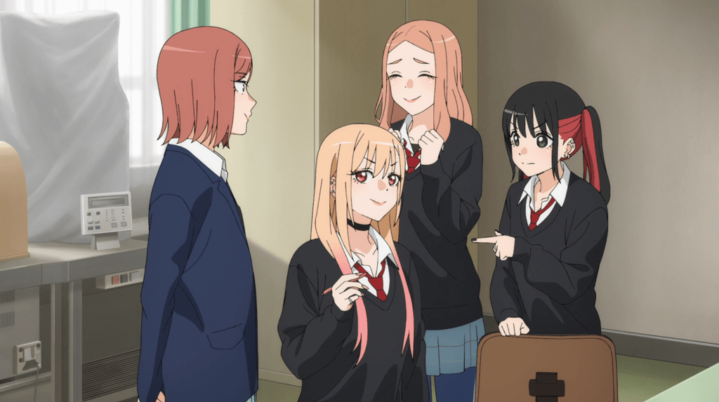Another classmate, Murakami, wants a picture of Marin in costume so he can show his sister, but is embarrassed to admit that he’s a fan of Prezhost. Gojo of course thinks there’s nothing to be embarrassed about, because he’s internalized the key message of the show: enjoy the things you enjoy, and don’t pay attention to the limiting labels that people like to put on different experiences. Murakami goes for it and takes a pic, but hilariously, he crops Marin’s head out of the picture, because he’s primarily interested in the Rei-suit. Marin blows up at him a bit, and the rest of the kids claim they want pictures.