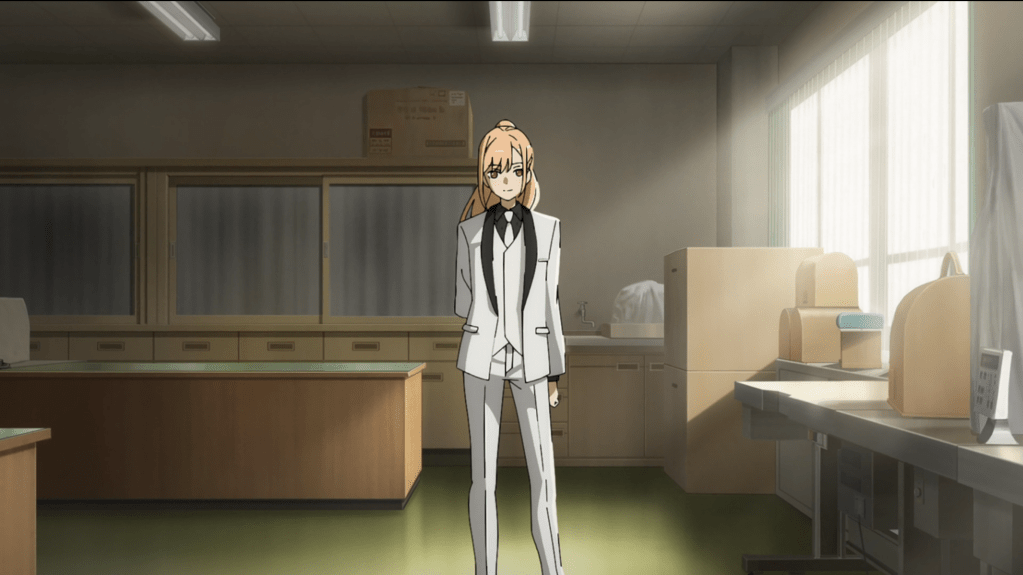 Flash forward to today, we see Ikumi looking at a flyer for a middle school reunion event. I would not go to a middle school reunion if you paid me…well, no, let’s be fair. I would go if you paid me maybe a million dollars, but not for much less. Credits!