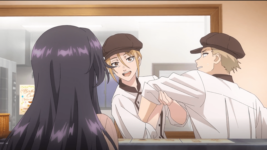 At Plain, Rintarou is manning the counter with his mom, brooding. His mother thinks he’s bummed because he failed another test, but when he tells her he passed, she doesn’t believe him; worse, she thinks he might have cheated. I feel for Rintarou’s mom here; it’s not nice of her to think that her own son might have cheated, but if she’s used to him bringing home failing grades all the time, it’s hard not to think that way. Kaoruko comes in for some cake, and Rintarou adorably tries to hide behind the display case. Mom isn’t having that behavior for one second.