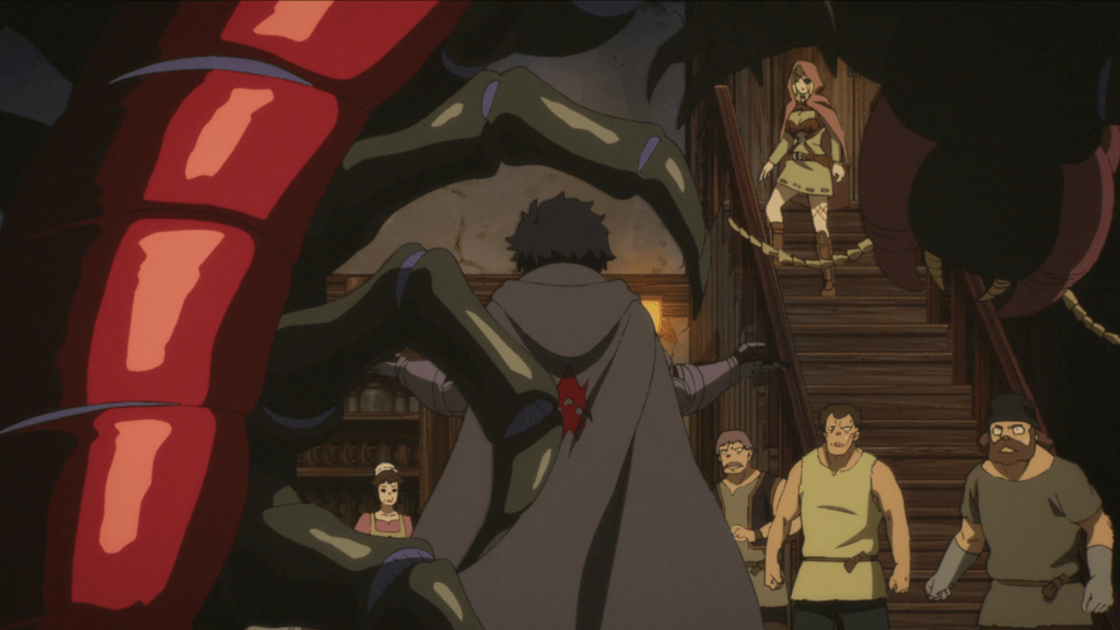Alicia, Nelluru and Luna enter an inn, and two brutes want to make an issue of the fact that Alicia is a mysterious woman with an eyepatch and a sword. Their Mom, Kari, who is about a quarter their size, puts them in their places and gives Alicia a chance to explain herself. When Alicia states that she and Nelluru are protecting Luna, Kari welcomes the trio to the inn. One of the men takes Nelluru’s luggage and staggers from the weight of it– what the hell did Nelluru lift from Vroko’s supplies? Solid bars of gold? After taking payment, Kari takes the trio to a plain but serviceable room where they can stay. Unfortunately, a creepy bug spies their whereabouts and Meynard is seeing through the bug’s eyes. Damn, it did not take him long to find them. Meynard sends his army of bugs into town, and boy it’s going to be hard for me to watch all these bugs swarming on screen; just the sight of them grosses me out.