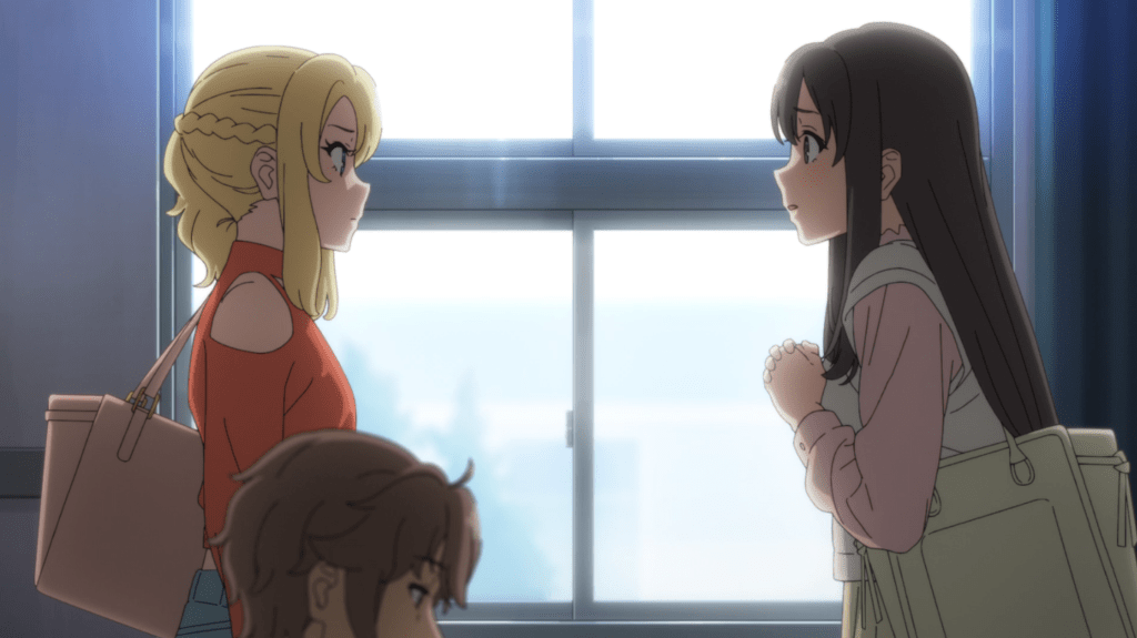 We end the episode back in Spanish class, where Uzuki comes up to Sakuta and asks “What did Nodoka say about me?” Arrgh, I hate it when people do this. Deal with your own problems and don’t quiz an intermediary. Grow up, Sweet Bullet ladies. Fortunately, Nodoka and Uzuki meet face-to-face– I’m so glad they didn’t drag out this fight for multiple episodes– and Nodoka notes to Sakuta that Uzuki was actually responding to how she was feeling, aka “Reading the Room,” something Uzuki is famously incapable of doing. I never thought about it before, but the more we learn about Uzuki, the more it seems like she’s on the spectrum, which is interesting. So we have our first Puberty Syndrome problem of the season: Idol Uzuki….developing the ability to read facial expressions. Well it’s not quite as dramatic as that time that Futaba split into two people, but I’m willing to play along and see where they go with it.