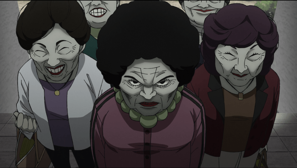 Meanwhile, back at the ranch, Okarun and Jiji get a visit from creepy gray ladies to match the creepy gray men. We find out that the Kitos are the landlords, and they’re not happy with Jiji’s sudden disappearing act, among other things. The main Kito lady whips out a hunting rifle in Jiji’s face, and I cringe. I was drilled in proper fire arms safety from a young age: You never point a gun at anything you aren’t fully prepared to immediately destroy, I don’t care if you’re some shady zombie landlady. Follow the rules! The creepy gray dudes from the hot spring come back to join the women, and the main lady gets scary-pissed when Jiji lies about Momo being part of their group.