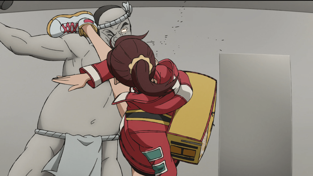 Momo gets back to Jiji’s house, and Jiji and Okarun are on the floor, looking beat up already. Momo wastes no time to try to rescue her boys and starts fighting the creepy gray dudes, and a truly cool fight scene ensues. I like the fact that Momo’s powers aren’t exactly classic telekinesis– that grabby-hand thing she does is unusual– but in this fight, she actually starts using classic forms, like a telekinetic shield. A telekinetic shield! The comic geek in me is flipping out. To be honest, I kind of thought she’s been shielding all along, otherwise there’s no way she could tank the hits she takes on this show; Momo has gotten slammed into stone and concrete walls at speeds that would kill normal people.