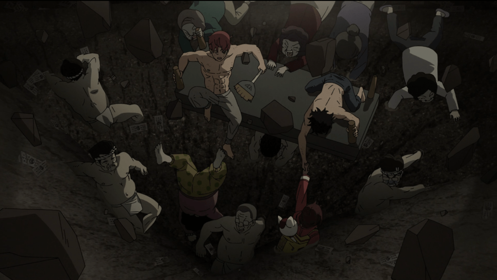 The floor in the secret room turns to sand, and Momo starts sinking in. Jiji and Okarun have had time to regroup and deck the entire Kito clan with a couch, but they just send everyone spiraling into the abyss. Then things get crazy and we see a huge cavern with a ton of houses– how does that make sense? Mom said that the outside of Jiji’s house was rebuilt several times to keep up with the times, but why would all the former houses have gotten sent down to the bottom of this cavern?