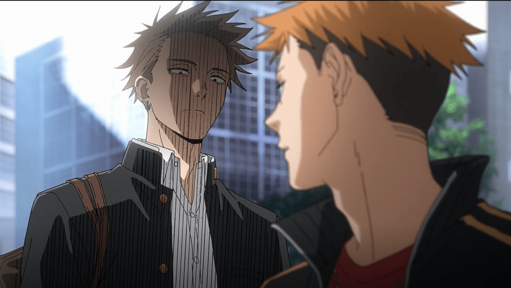 What the hell? I can buy that the dudes would hassle Kaoruko and try to get them to come with them, but escalating to punching her in the face seems a bit much. I hesitate to use the word “unrealistic” because it’s not like I watch anime for the gritty realism, but it kind of took me out of the moment a bit. Going to slap her would have been more believable. Anyway, Rintarou is not going to let this happen and jumps in front of Kaoruko, and the two losers run off rather than face his wrath. Kaoruko feels responsible for Rintarou bleeding and confides in him that she doesn’t think he’s scary at all.