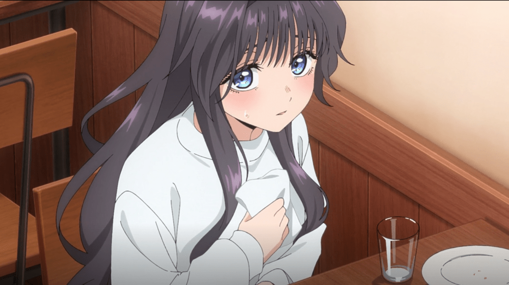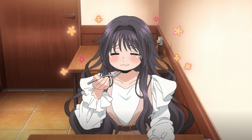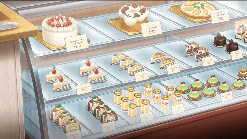 One day, when the staff is shorthanded and Rintarou is working the front register, he notices a girl who’s packing away a significant amount of cake. He marvels at the sheer amount of cake she’s eating, and I feel represented in this anime right now. The girl blushes like mad and runs off, and we have our romance.