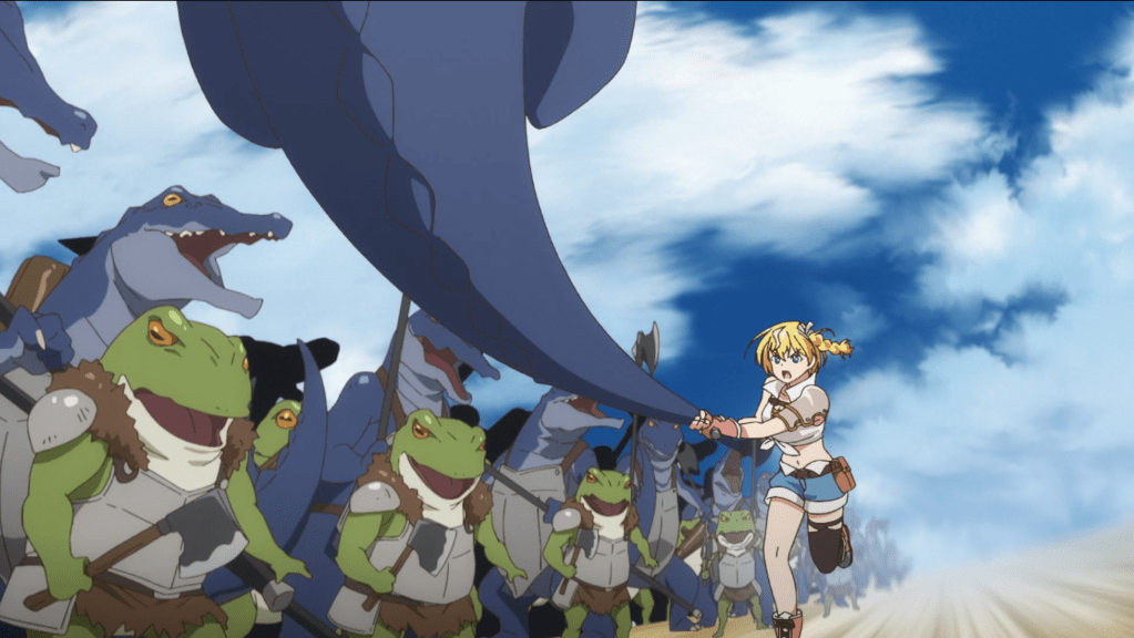 The little beasties report that there are no more survivors (ouch), tons of monsters are massing near the hole in the village wall, and they could see very large monsters off in the distance. Everyone nearly gives into despair, but Mishuel gives an inspiring pep talk that keeps everyone focused on the task at hand. Did Mishuel just gain +50 points in oratory in this episode? His whole schtick is that his social skills are terrible. I guess he’ll need a new schtick.