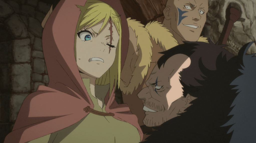 Clen has been stationed serving food to the bandits while Nell nurses Luna. Of course, since it’s been one minute and nothing horrible has happened, two bandits take Nell outside to rape her, and beat her up just for funsies. Clen kills them both, and I’m feeling good about it. Then we get Nell’s story: born a slave, she’s been abused by the Ravens for her entire life and her only reason to live is that she likes being able to feed the babies, in the hope they’ll grow up and find the happiness that her own stillborn children were denied. I wrote about Nell a little already in my post about anime and sexual assault, but her story is hard to hear, in part because you know there are women out there who historically have had (and continue to have) similar experiences.