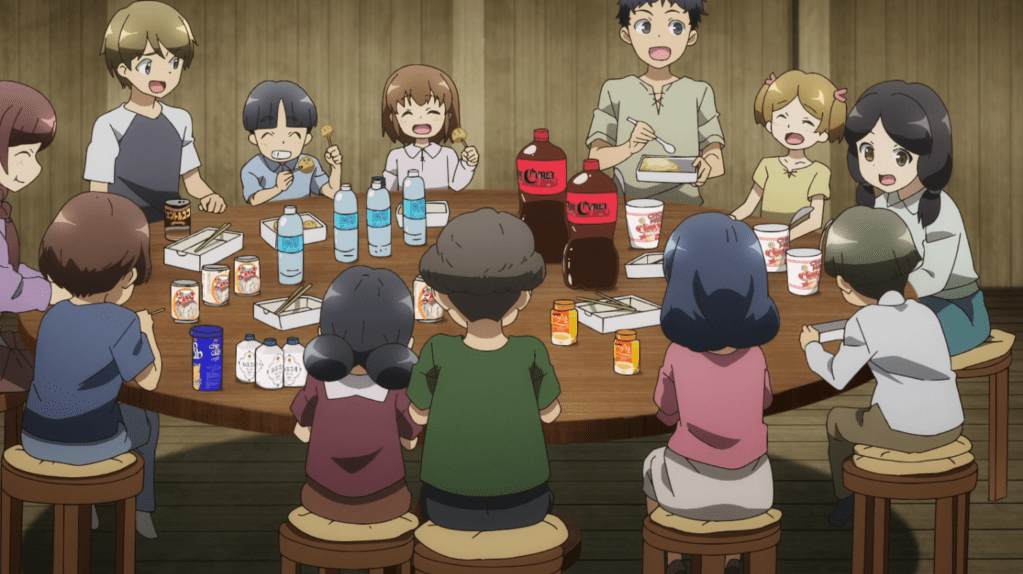 Last time, our intrepid vending machine hero helped close the gap in the village wall for Clearview Lake Village, and the constant monster attacks have died down. Now, everybody is working together to rebuild the village, despite the heat. Hulemy is working on getting the transportation circle back up and running, while Lammis helps by clearing debris. Shirley drops by, and I mention this only because the anime seems to have decided this season that 99% of the fanservice will now only feature Shirley, which I approve of: she’s clearly in at least her late 20s/early 30s and a more appropriate target to sexualize than Lammis. Lammis is a sweet kid, they treat her right.